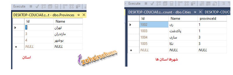 در شکل بالا کلیدی اصلی جدول استان (Id) با کلید خارجی در جدول شهرستان (provinceId) ارتباط برقرار کرده است.
